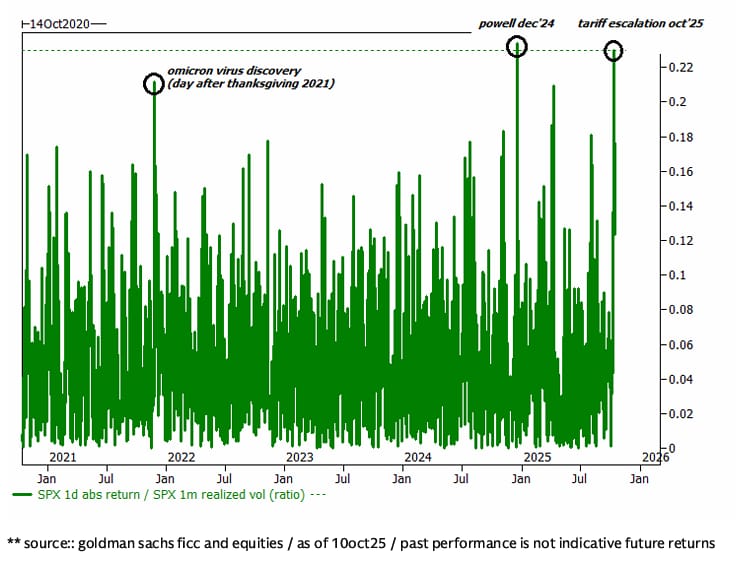 En lo que parecía ser un mercado a prueba de balas, aparecieron fisuras el 10 de octubre en forma de disputas comerciales, provocando uno de los mayores “eventos de volatilidad inesperada” desde la crisis financiera global (GFC), medido por la relación entre el shock de 1 día y la volatilidad realizada a 1 mes.