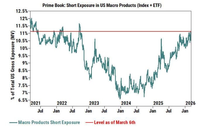 Según GSPB (Goldman Sachs Prime Brokerage), la exposición corta en productos macro de EE. UU. (índices y ETFs) —como porcentaje del valor de mercado bruto total de EE. UU. en su libro Prime— se encuentra en el nivel más alto desde septiembre de 2022 y en el percentil 93 frente a los últimos cinco años.