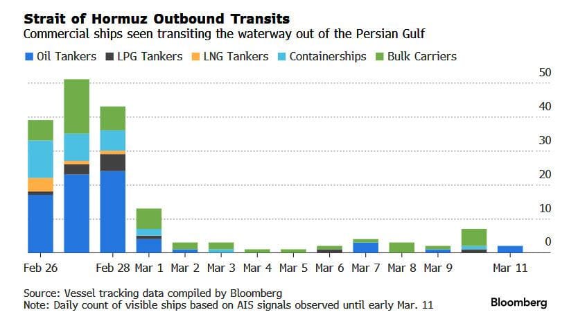 El martes se registraron ocho tránsitos comerciales y la mañana del miércoles se identificaron cuatro más, la mayoría de los cuales tienen vínculos con Irán o vínculos comerciales con China, según datos de seguimiento de buques compilados por Bloomberg.