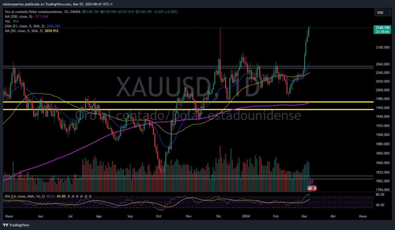 El precio del oro supera los 2148 dólares, alcanzando un nuevo máximo histórico