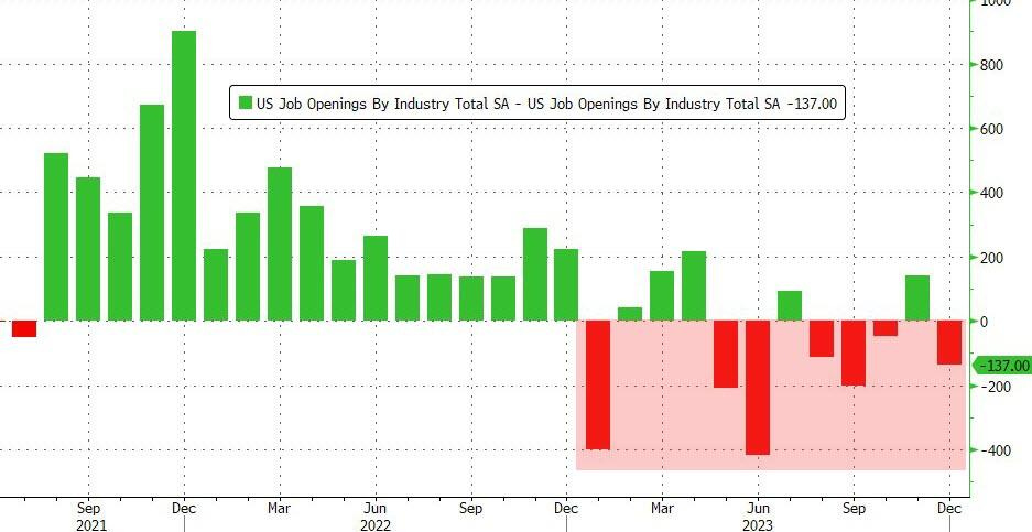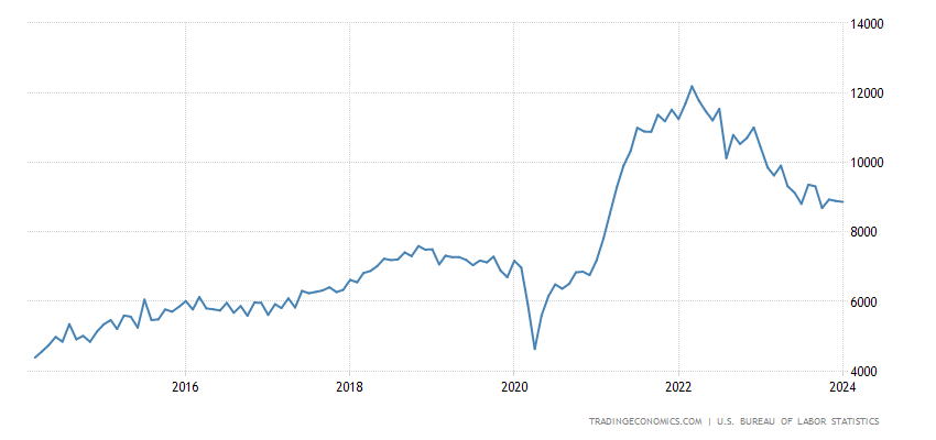 El número de ofertas de empleo bajó en 26.000 con respecto al mes anterior y se situó en 8,863 millones en enero de 2024, el más bajo en tres meses y por debajo del consenso del mercado de 8,9 millones. Durante el mes, las ofertas de empleo aumentaron en la fabricación de bienes no duraderos (+82.000), pero disminuyeron en los servicios educativos privados (-41.000).