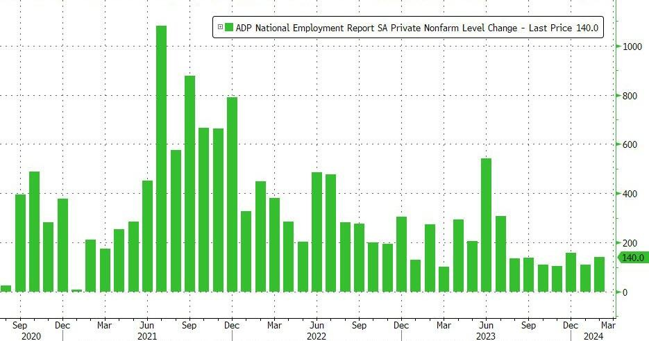 Las empresas privadas de EE.UU. contrataron 140.000 trabajadores en febrero de 2024, tras una revisión al alza de 111.000 en enero, pero ligeramente por debajo de las previsiones de 150.000.