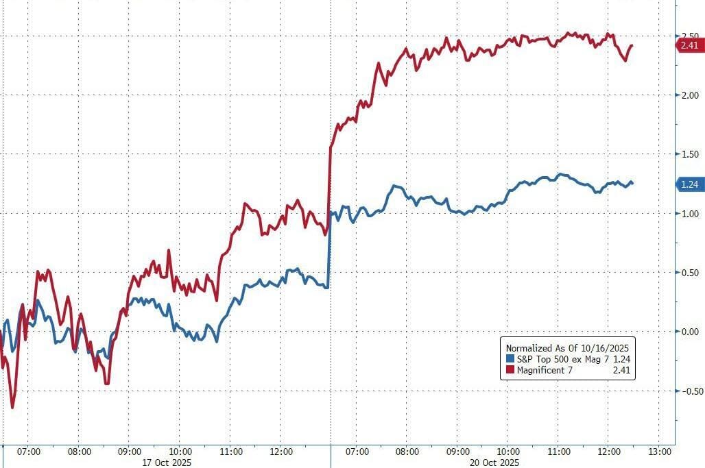 Los bancos regionales volvieron a subir sólidamente hoy, liderando los sectores y recuperando la debilidad de la semana pasada. AAPL subió más de un 4% (la serie iPhone 17 superó en ventas al iPhone 16 en un 14% durante sus respectivos primeros 10 días de venta en EE. UU. y China) hasta un nuevo récord por primera vez desde diciembre de 2024, acercándose una vez más a una capitalización de mercado de 4 billones de dólares. AAPL llevó a las acciones de la Mag7 a otro gran día de desempeño superior en relación con el S&P 493.