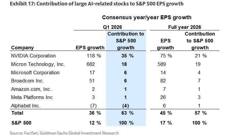 Cabe recordar que las mayores acciones relacionadas con la IA en el índice deberían impulsar más del 60% del crecimiento de las ganancias por acción del S&P 500 durante el primer trimestre.