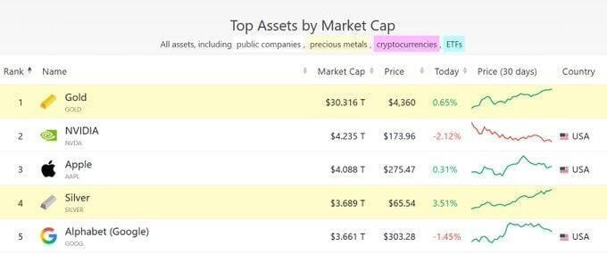 Solo la plata se salva… El aumento de la plata hoy la colocó por encima de Google como el cuarto activo más grande por capitalización de mercado...
