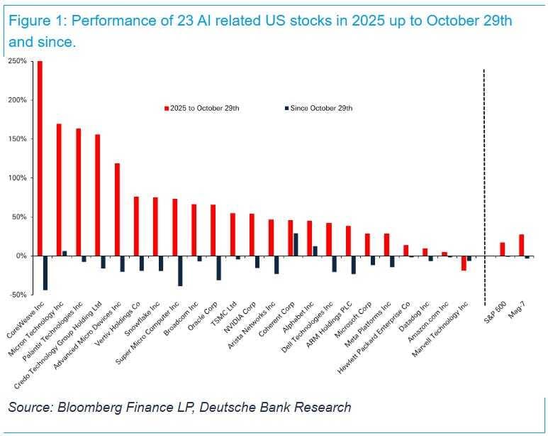 DB analiza el rendimiento de 23 acciones relacionadas con la IA, comparando la rentabilidad acumulada hasta el 29 de octubre con la de las seis semanas posteriores.