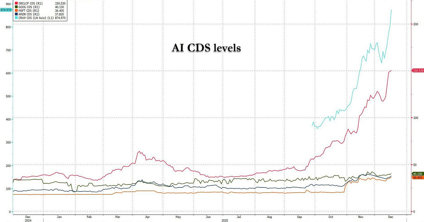 Oracle es un desastre: ha vuelto a sus niveles más bajos desde mediados de junio (por debajo de su media móvil de 200 días), mientras sus diferenciales de crédito se disparan a niveles propios de la crisis financiera global. Las opiniones negativas sobre Oracle se han convertido prácticamente en sinónimo del sentimiento hacia el Nasdaq en su conjunto. Quizá esto esté empezando a convertirse en un evento sistémico.