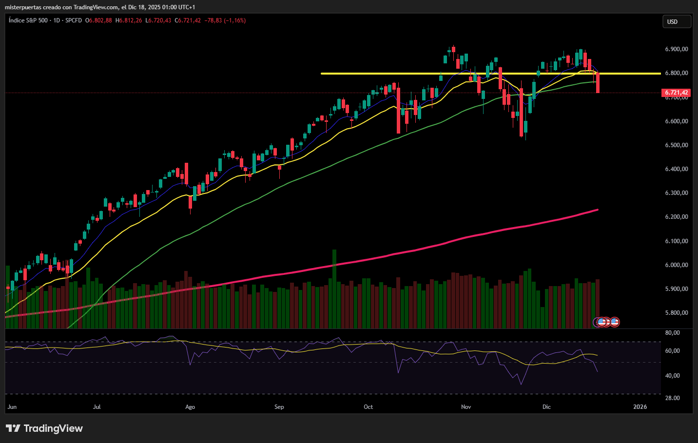Ojo, porque si analizamos el SPX, tuvo amplitud positiva, es decir, hubo más valores subiendo que bajando. Aun así, no fue suficiente para evitar caer por debajo de los 6.800 puntos, perder el último soporte importante, entrar en terreno negativo y activar presión vendedora por parte de los CTA.