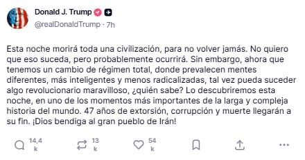 A tan solo unas horas de la fecha límite que Trump se autoimpuso, en la que afirmó que “toda una civilización morirá esta noche”, el líder de Pakistán y principal mediador, el primer ministro Shehbaz Sharif, ha intentado ofrecer una tregua de última hora, con la esperanza de que Estados Unidos evite su campaña de aniquilación:
