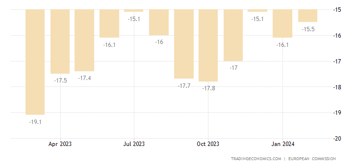 4- Confianza de los consumidores de la zona euro, febrero P: -15,5 (est -15,5; prevR -15,9)