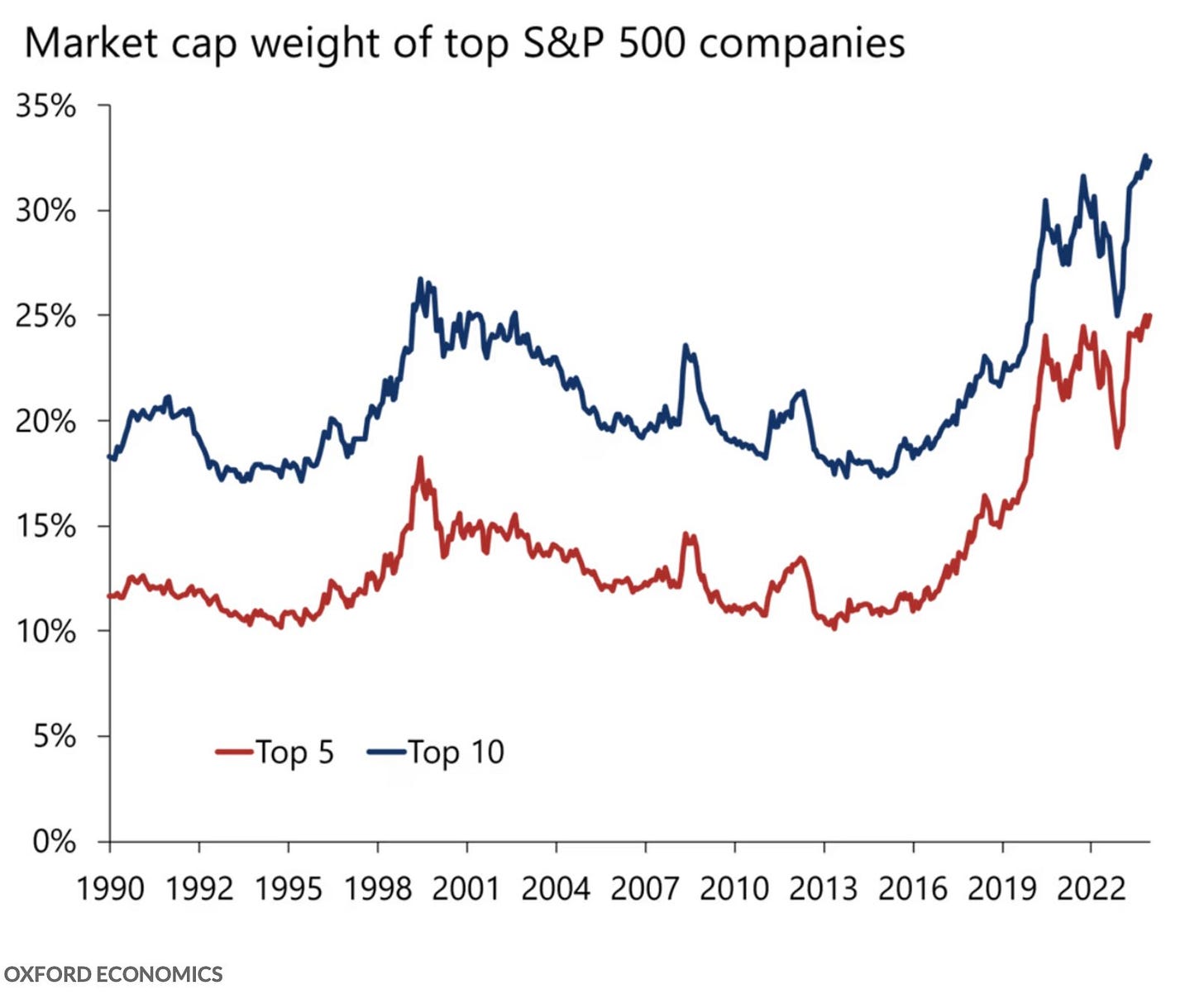 1- Las 10 mayores empresas del S&P 500 representan el 32% del índice total, un máximo histórico y unos 6 puntos porcentuales más que en el punto álgido de la burbuja de las puntocom.