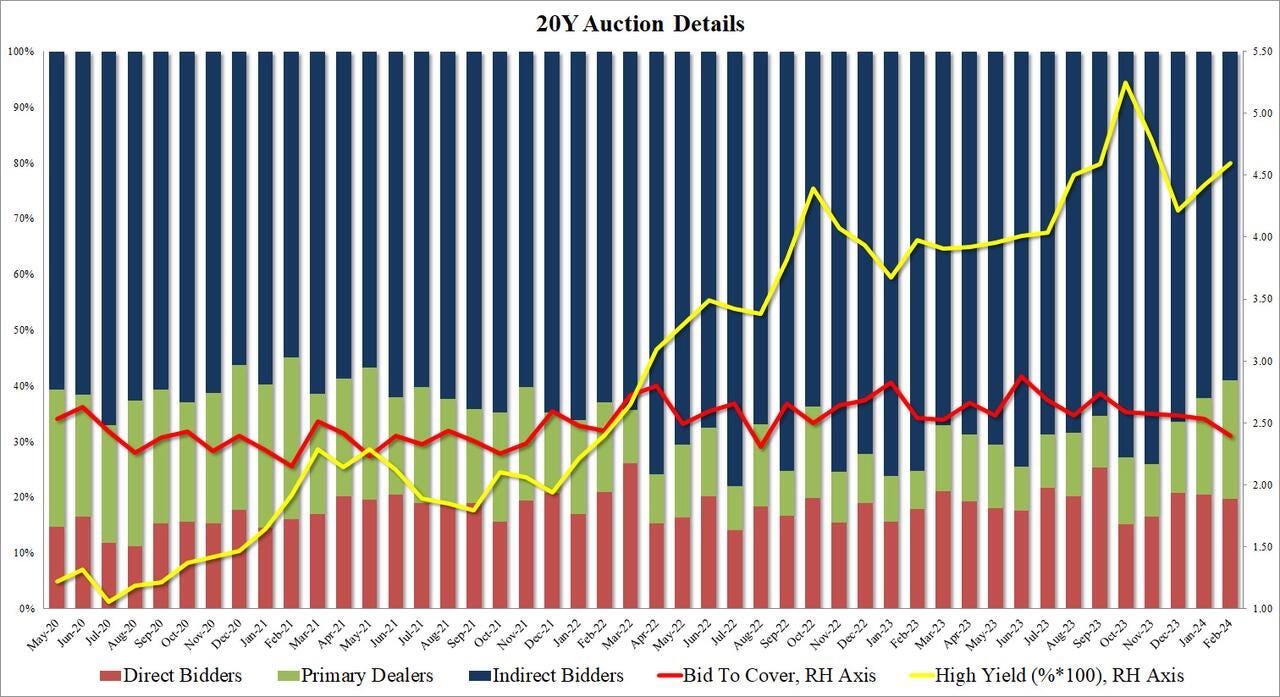 5- La subasta a 20 años se colocó mal, los resultados internos fueron aún más feos, con adjudicaciones indirectas de sólo el 59,08%, por debajo del 62,16% del mes pasado, muy por debajo de la media reciente del 68,2% y la más baja desde mayo de 2021. Por su parte, los contratos directos perdieron un 19,7%, por lo que los distribuidores se quedaron con un 21,2%, el porcentaje más alto desde mayo de 2021.