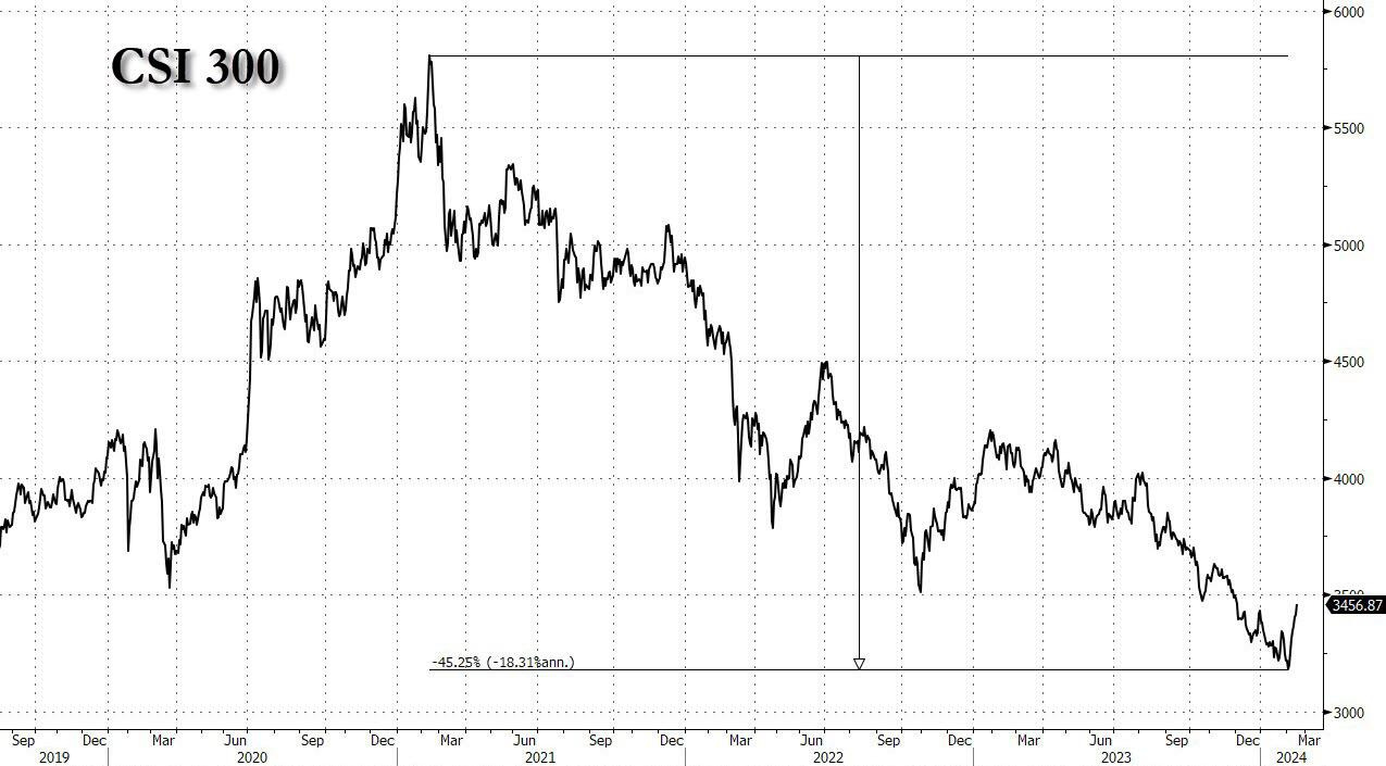 Si bien estos intentos de pánico por restaurar la confianza nunca funcionan a largo plazo y eventualmente requerirán un estímulo aún más masivo para evitar otro colapso, las recientes medidas para contener las ventas han generado resultados modestos y el CSI 300 subió un 1,4% el miércoles, extendiendo su repuntar desde el mínimo de cierre de este año hasta el 8,7%. Todavía ha bajado alrededor del 17% respecto al año pasado.