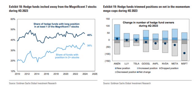 3- El peso de los "Magníficos 7" en las carteras de fondos de cobertura continuó aumentando junto con una inclinación récord hacia el Momentum y el hacinamiento extremo. Estas acciones representan el 13% del total de la cartera larga de fondos de cobertura, un máximo histórico pero solo la mitad de su peso colectivo en el Russell 3000. Todos los miembros de los "Magníficos 7" excepto TSLA se encuentran entre los 10 principales miembros de nuestra lista VIP de fondos de cobertura
