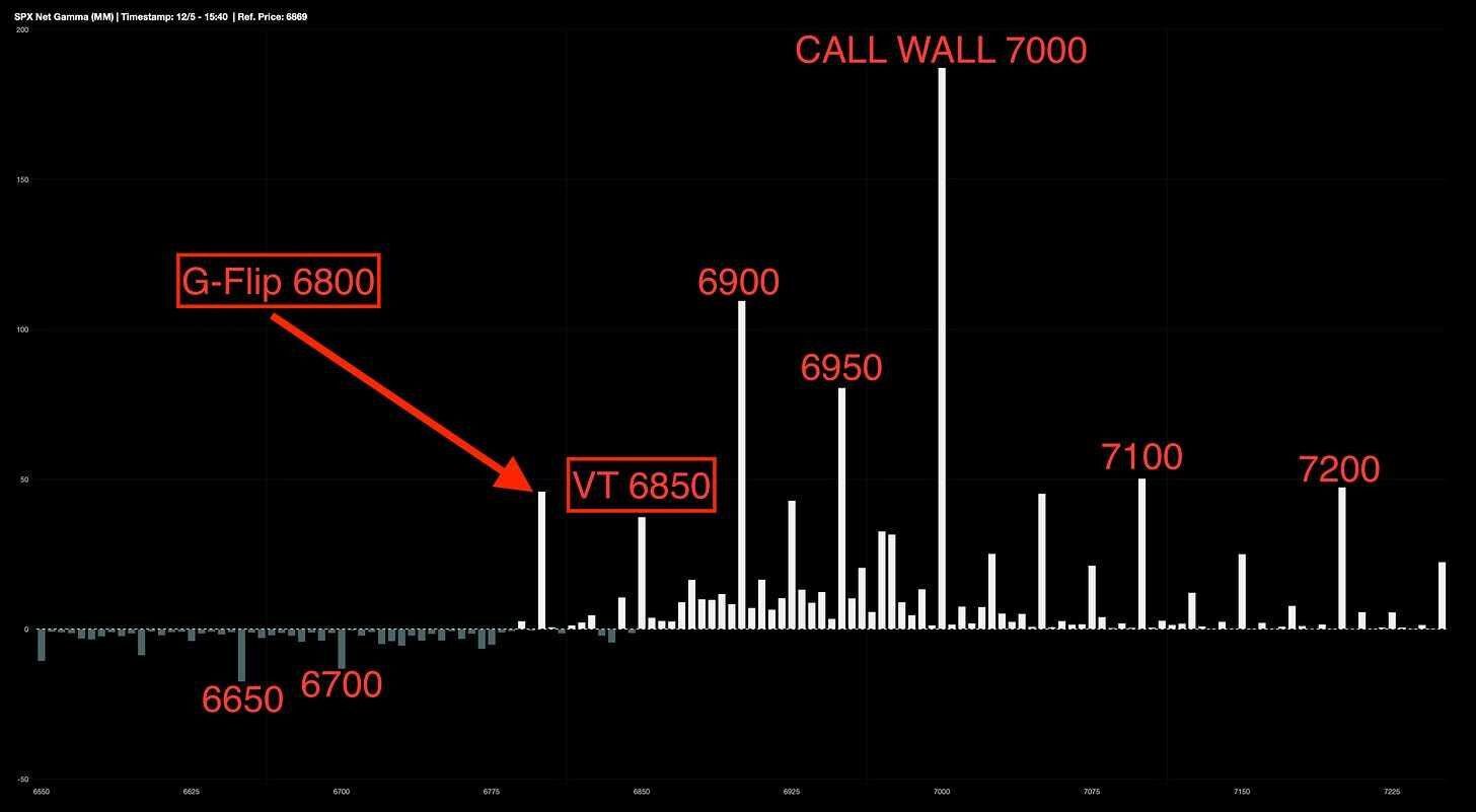 Analizando el mapa de gamma, se observa claramente que el nivel pin se sitúa en 7,000, donde se concentra la mayor parte de la gamma y que puede actuar como un imán para el precio de cara al vencimiento. El VT ha subido a 6,850, un nivel de soporte importante a vigilar.