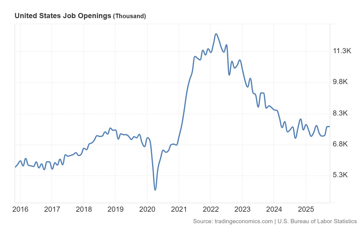 Las ofertas de empleo en Estados Unidos aumentaron en 12.000, hasta 7,670 millones en octubre de 2025, frente a los 7,658 millones de septiembre, según datos retrasados de la Oficina de Estadísticas Laborales (BLS). La cifra de septiembre reflejó un salto de 431.000 desde los 7,227 millones de agosto, y ambos meses superaron las expectativas de 7,2 millones.