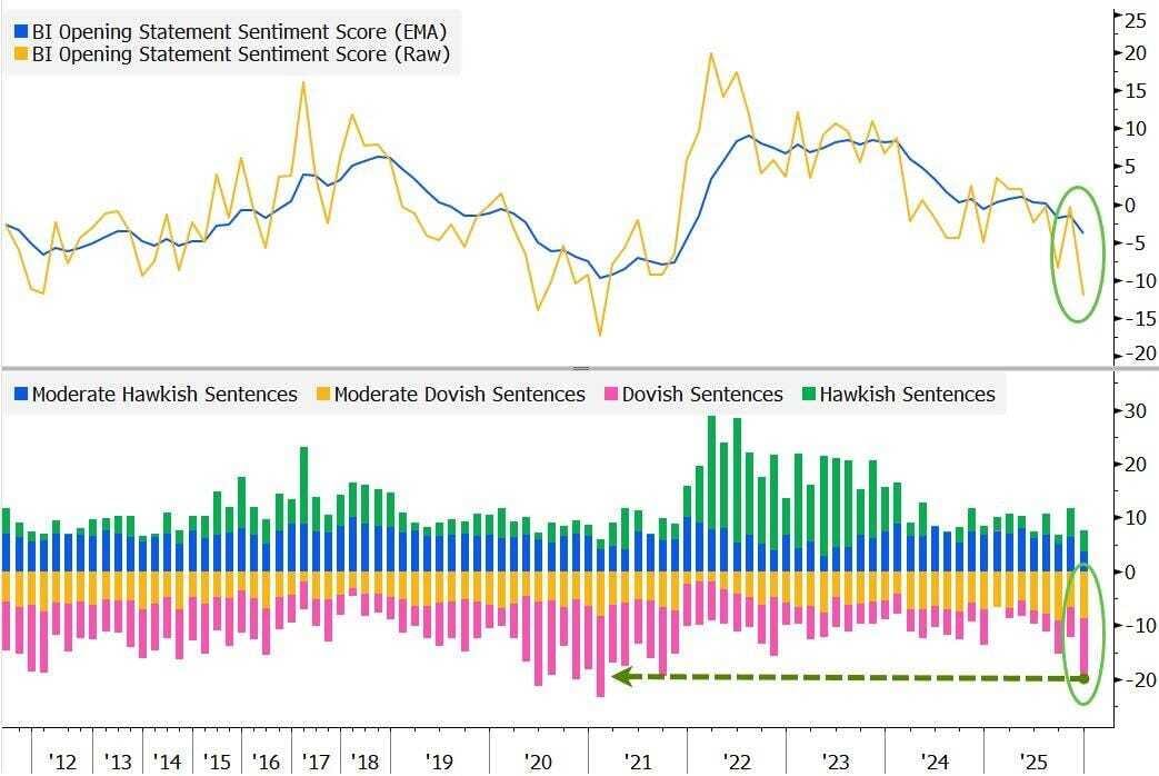 El modelo de procesamiento del lenguaje natural de la Estrategia de Tasas de Bloomberg para el sentimiento de la Fed mostró que las declaraciones iniciales de Powell fueron más moderadas que las de la reunión de octubre, y las más moderadas desde 2021, según Bloomberg.