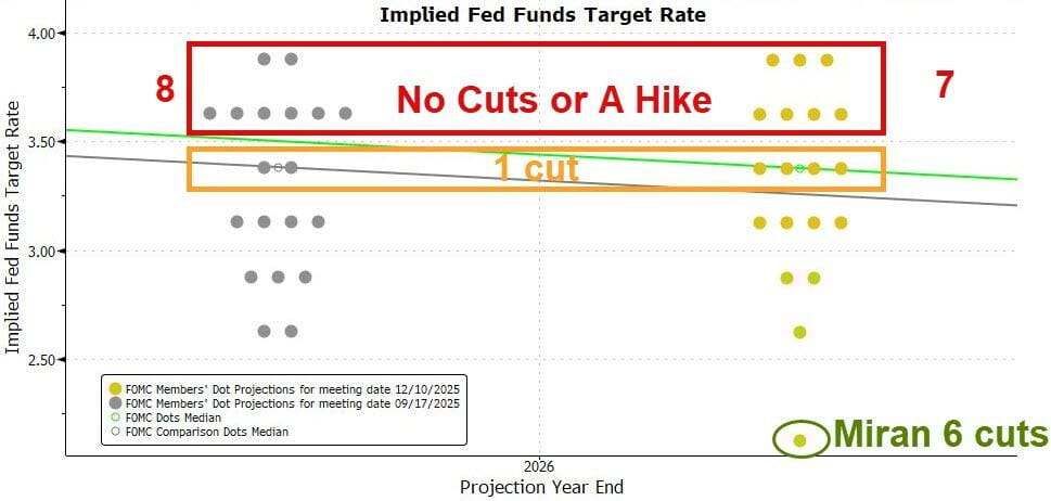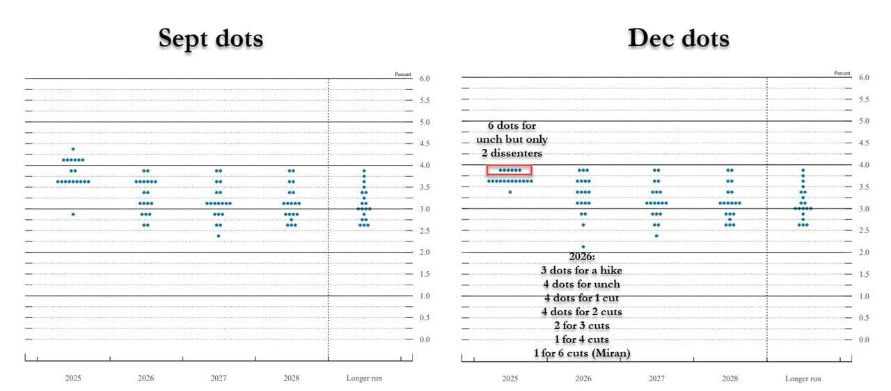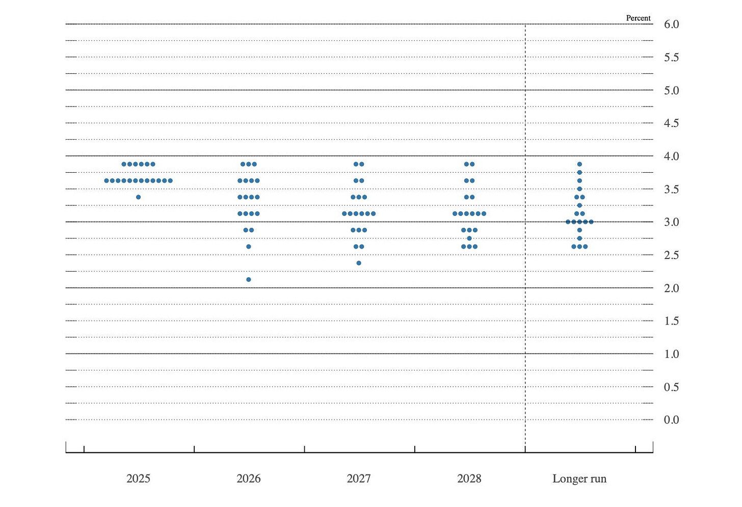 El dot plot mediano para 2026 no cambia, la mayoría espera entre 0 y 50pb de bajada en 2026.