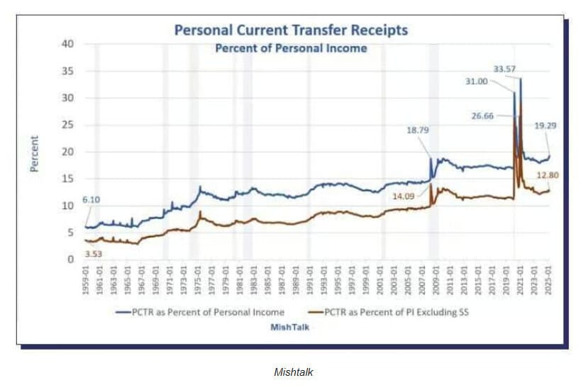 El 19.3% de los ingresos personales ya son transferencias del Estado: Seguridad Social, Medicaid, Medicare… Un nivel solo visto en crisis como la de 2008 o la pandemia.