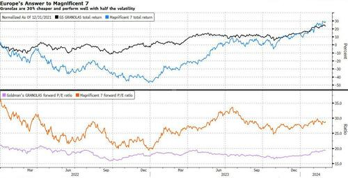 Pero demos al César lo que es del César: los estrategas de Goldman Sachs crearon un acrónimo de megacap para Europa allá por 2020, durante el primer confinamiento. GSK, Roche, ASML, Nestlé, Novartis, Novo Nordisk, L'Oreal, LVMH, Astrazeneca, SAP y Sanofi han sido desde entonces las “ GRANOLAS ”. El grupo se ha comportado como el Mag 7 desde principios de 2022, con la mitad de volatilidad y un 30% más barato.