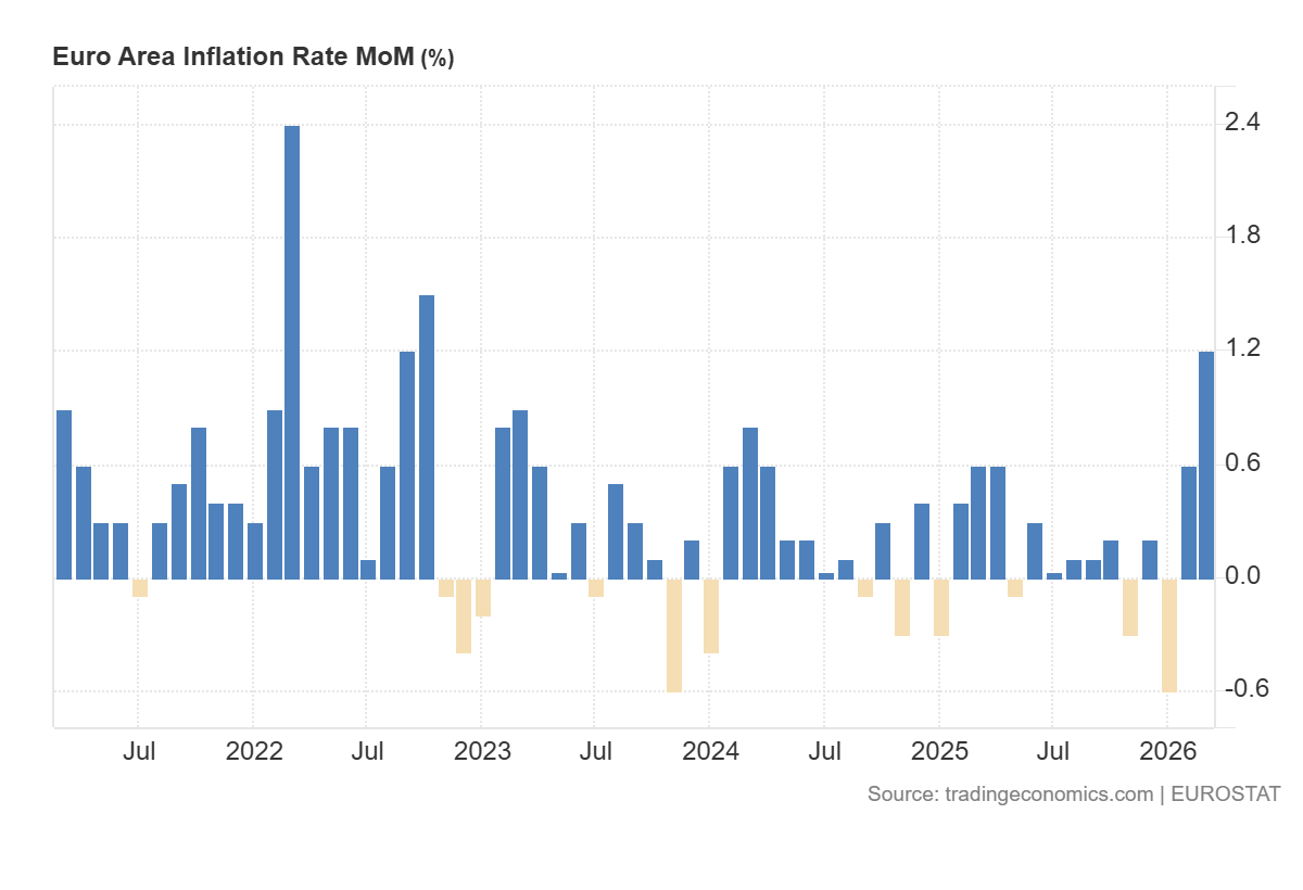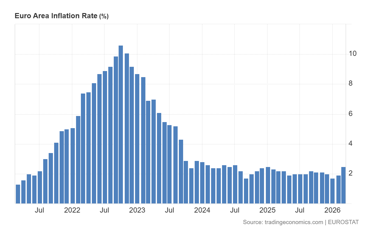 La inflación anual de la zona euro subió al 2,5% en marzo de 2026, frente al 1,9% de febrero y ligeramente por debajo de las expectativas del mercado (2,6%), según una estimación preliminar.