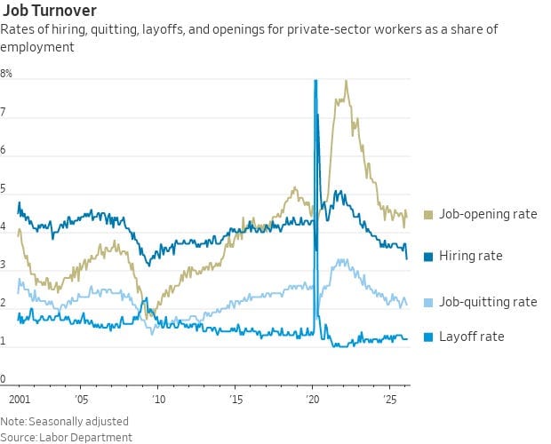 Mientras tanto, las contrataciones descendieron hasta los 4,8 millones y las separaciones totales apenas variaron, situándose en 5,0 millones. Dentro de estas, las renuncias (3,0 millones) se mantuvieron prácticamente sin cambios, al igual que los despidos (1,7 millones).