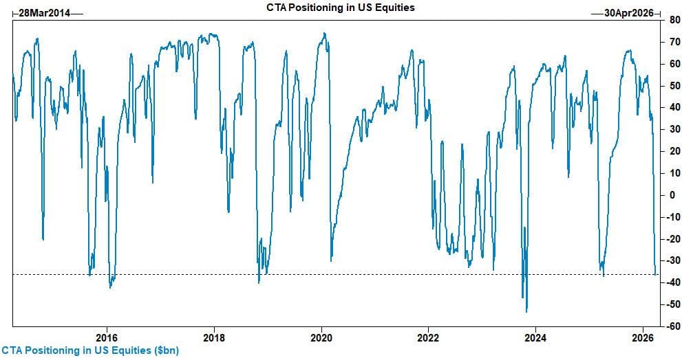 Los CTA han vendido casi la cifra récord de 184.000 millones de dólares en acciones globales durante el último mes (de los cuales 55.000 millones de dólares en EE. UU.).