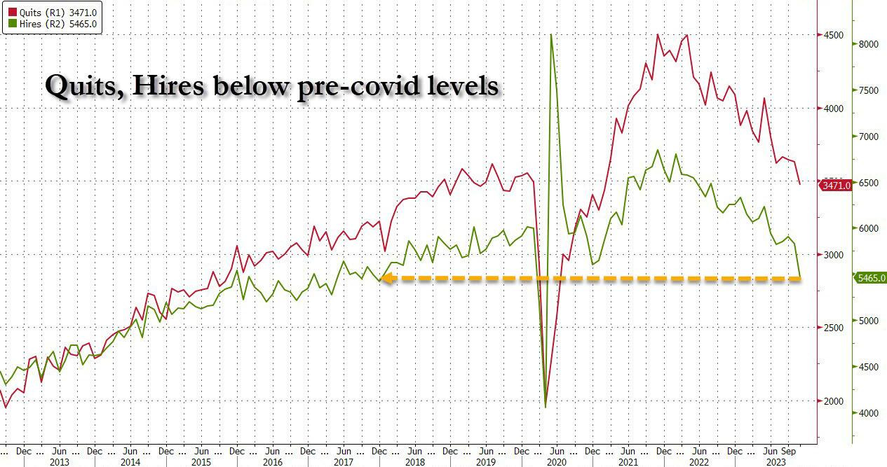 El número de contrataciones también se desplomó en noviembre, cayendo en 363.000 a 5,465 millones, muy por debajo de los niveles anteriores al covid...