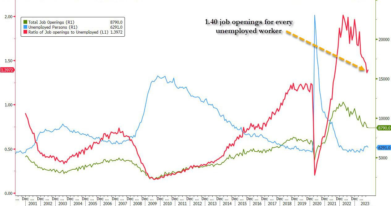 En noviembre el número de ofertas de empleo para desempleados cayó a solo 1,34, el nivel más bajo desde agosto de 2021 y casi de nuevo a los niveles pre-covid de 1,3... y muy lejos del récord de 2,0 alcanzado a principios de 2022.