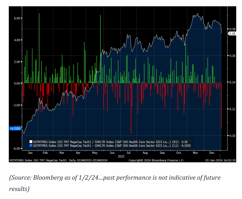 3- Después de un año de rendimiento superior de MegaCap frente a Healthcare, el sector de atención médica tuvo un mejor rendimiento al comienzo de 2024, con el segundo mayor día de mejor rendimiento en los últimos 12 meses - GS