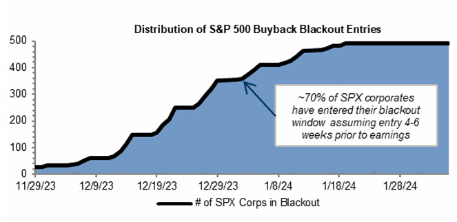 2- Recompras de acciones: estimamos que aproximadamente el 70% del S&P 500 está en período de bloqueo, con aproximadamente el 80% estimado que estará en bloqueo para el final de la semana. Típicamente, estimamos que los flujos disminuyen alrededor del 30-35% durante el período de bloqueo. - GS