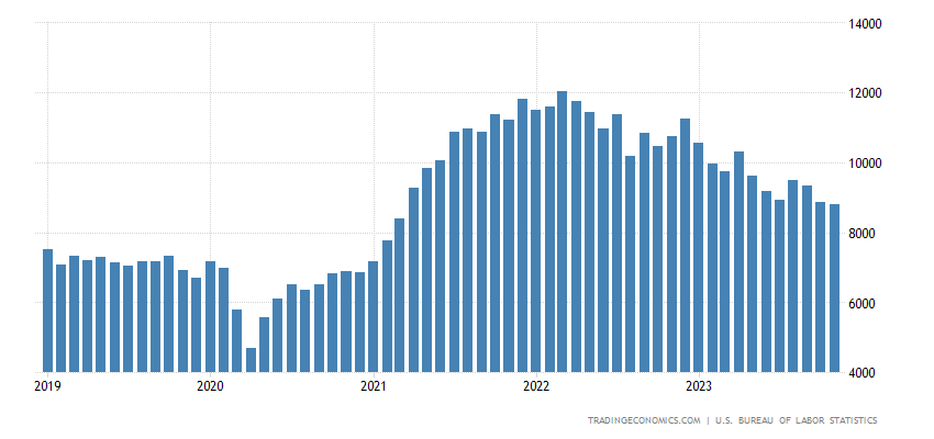 El número de vacantes disminuyó en 62,000 con respecto al mes anterior, llegando a 8.790 millones, quedando por debajo del consenso del mercado de 8.85 millones.
