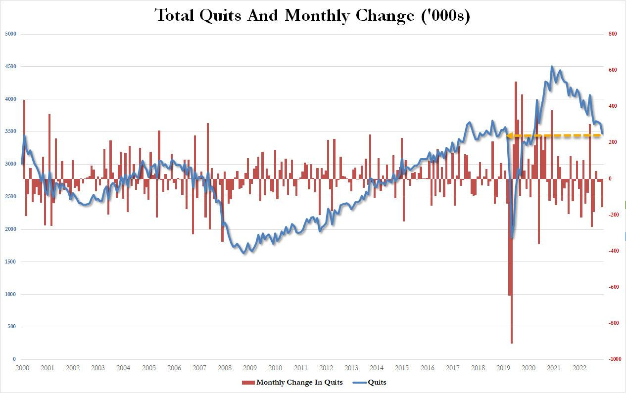 A medida que el número de puestos vacantes cayó al nivel más bajo en más de dos años, el número de personas que dejaron sus trabajos (indicador tradicionalmente estrechamente asociado con la solidez del mercado laboral, ya que muestra que los trabajadores confían en que pueden encontrar un mejor salario en otros lugares) cayó en 157.000 3,471 millones, lo que se sitúa en el nivel de 3,4 millones informado en febrero de 2020, justo antes del cierre de la pandemia.