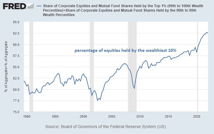6- El 92,5% de las acciones pertenecen al 10% más rico de los estadounidenses. Se trata de una concentración de la propiedad de acciones sin precedentes.
