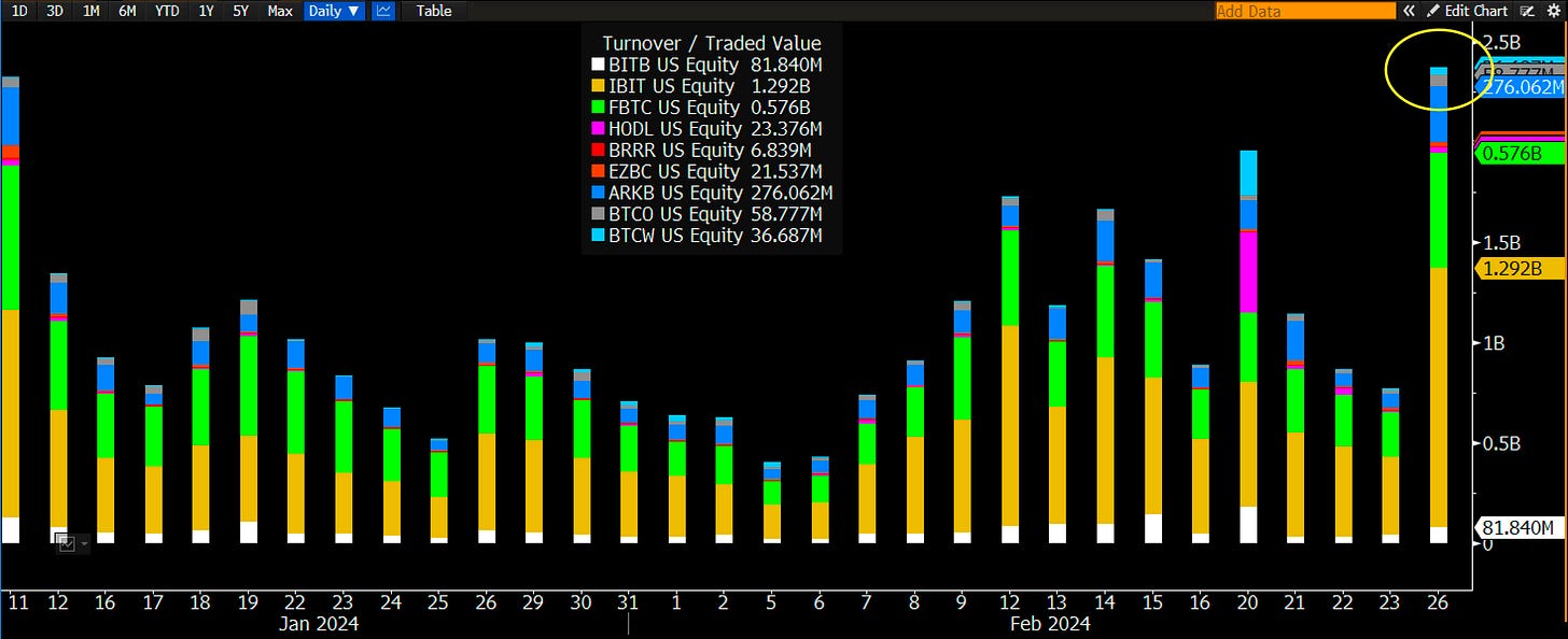 Según Eric Balchunas Analista Senior de ETFs para Bloomberg, los Nueve Nuevos ETFs de Bitcoin batieron el lunes su récord histórico de volumen con 2.400 millones de dólares