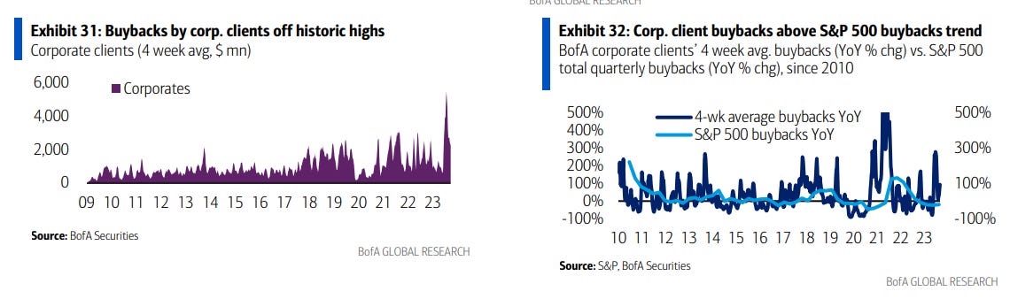 1- Las recompras de acciones de clientes corporativos se desaceleraron y están por debajo de los niveles estacionales típicos en este momento por segunda semana consecutiva después de fuertes tendencias a principios de esta temporada de ganancias. En lo que va del año, las recompras como porcentaje de la capitalización de mercado del S&P 500 (0.31%) están por encima de los máximos de '23 (0.28%) en este momento.