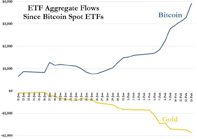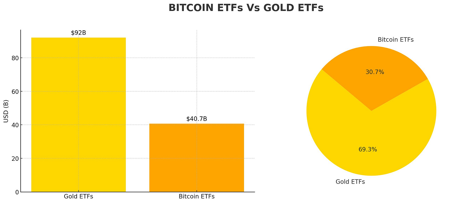 Según Bitcoin Archive… Los ETFs de Bitcoin están alcanzando a los ETFs de Oro en activos. $40.7b para $BTC $92b para Oro ¡Después de sólo 31 días de negociación!