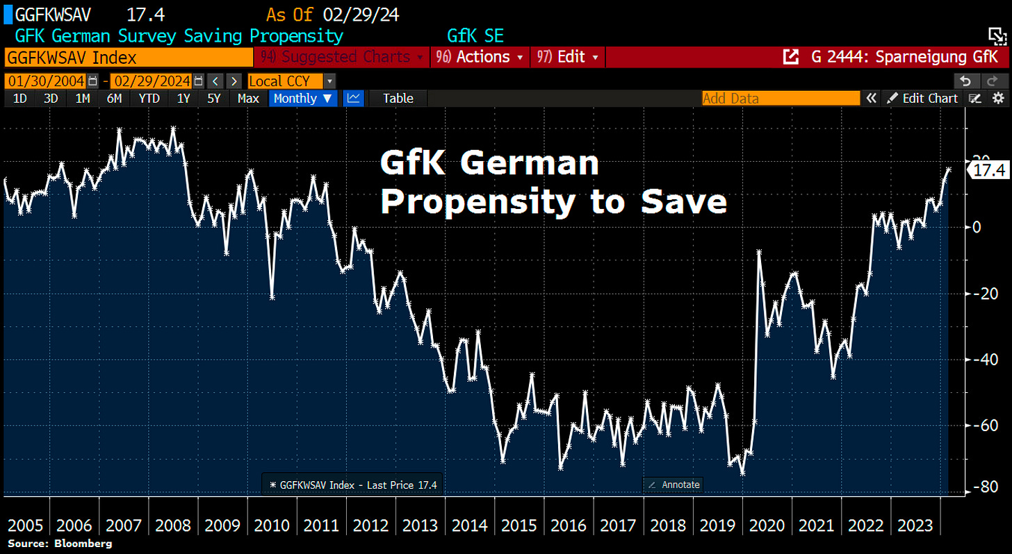 La disposición de los alemanes a ahorrar alcanzó su nivel más alto desde junio de 2008, mientras que la moral de los consumidores sigue siendo baja.
