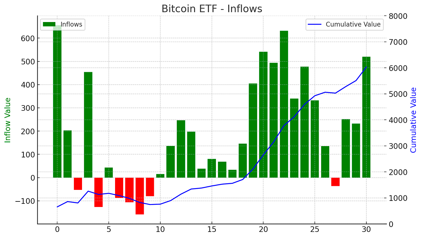 Estos volumenes suponieron la tercera mayor entrada diaria de ETFs Bitcoin. Sólo ha habido 1 día de salidas en los últimos 21 días de negociación.
