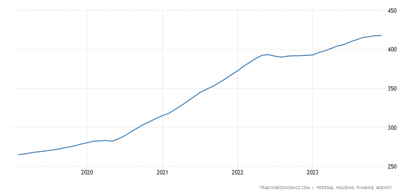 Los precios medios de las viviendas unifamiliares con hipotecas garantizadas en Estados Unidos experimentaron un aumento del 0,1% en diciembre de 2023, frente a la subida del 0,4% registrada en noviembre.