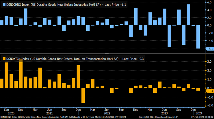 Los nuevos pedidos de bienes duraderos manufacturados en los Estados Unidos cayeron un 6.1% mes a mes en enero de 2024, más de lo esperado por el mercado, que preveía una caída del 4.5%, y tras una disminución del 0.3% en diciembre.