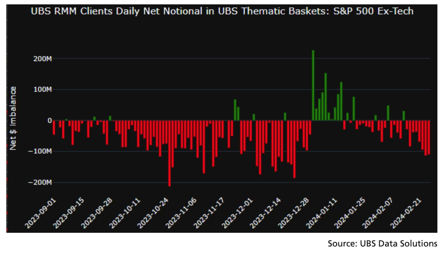 2- La aceleración de las entradas en Nvidia se ha producido a expensas del resto del S&P 500. El lunes, hubo salidas de 29 millones de dólares de clientes de UBS RMM, ya que las entradas de Tech (tanto de acciones individuales como de ETF) se vieron compensadas por ventas generalizadas en las acciones del S&P 500 (ex Tech).