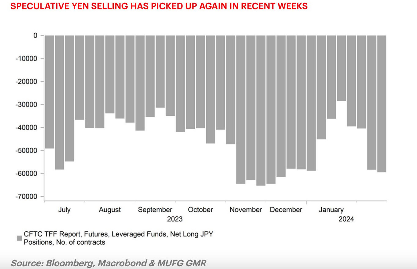 Según MUFG, las posiciones cortas netas en yenes han aumentado recientemente, lo que podría convencer al Banco de Japón de que es el momento adecuado para subir los tipos.