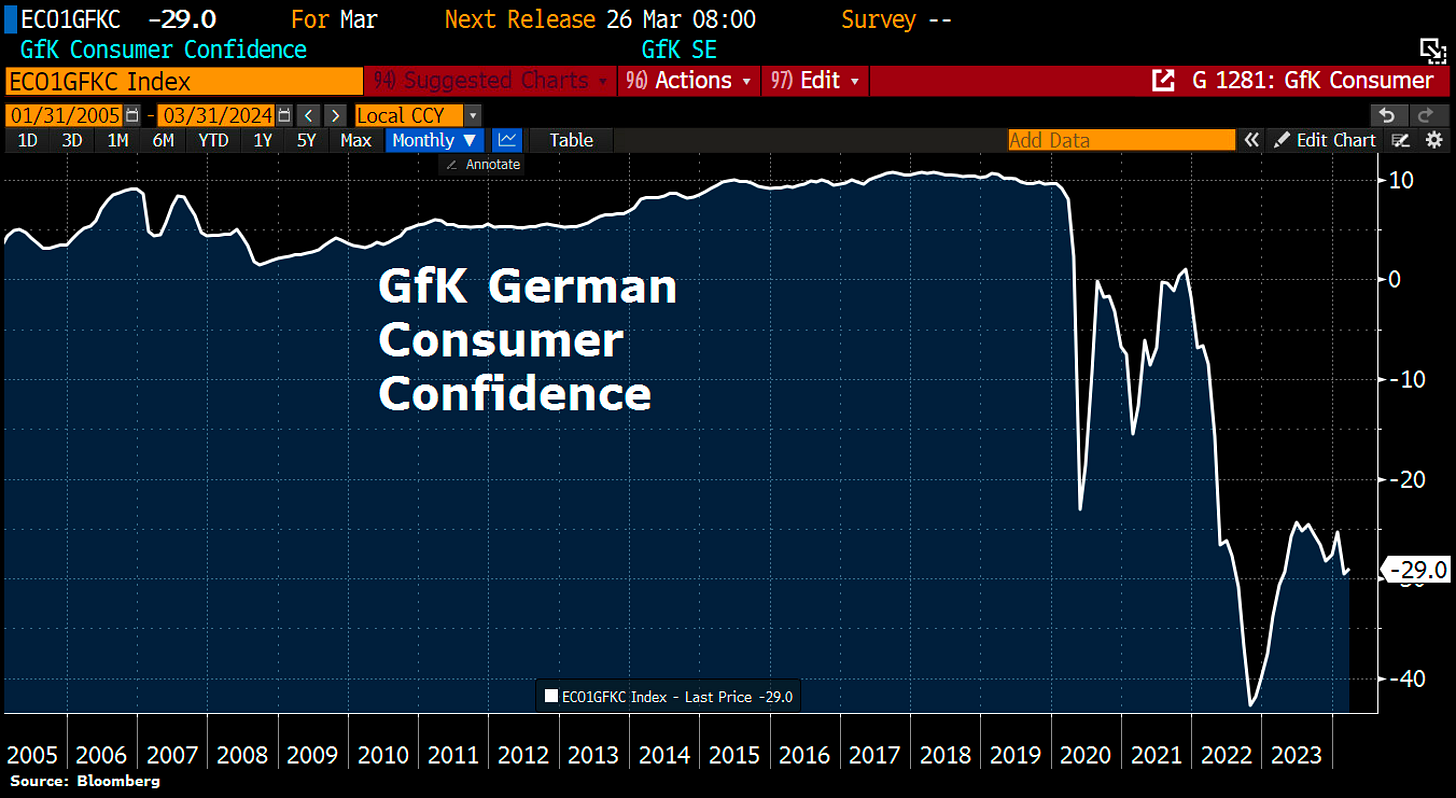 GfK dijo que su encuesta prospectiva de ~ 2.000 personas se mantuvo aproximadamente estable en menos 29 puntos para marzo, después de que el mes anterior viera una fuerte caída a -29,6 puntos.