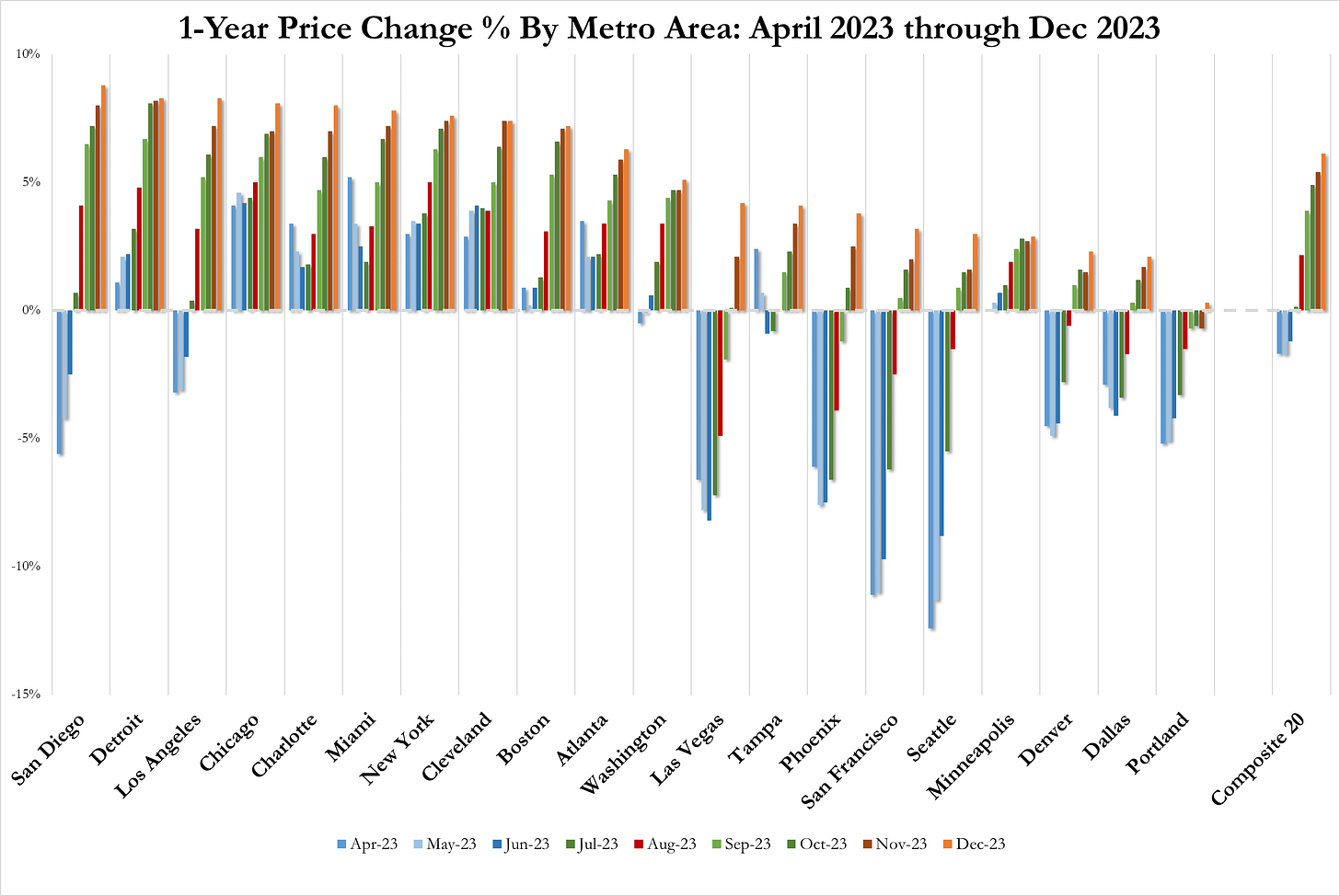 El índice S&P CoreLogic Case-Shiller de precios de la vivienda en 20 ciudades de EE.UU. subió un 6,1% interanual en diciembre de 2023, la mayor subida desde noviembre de 2022, tras un aumento del 5,4% en noviembre.