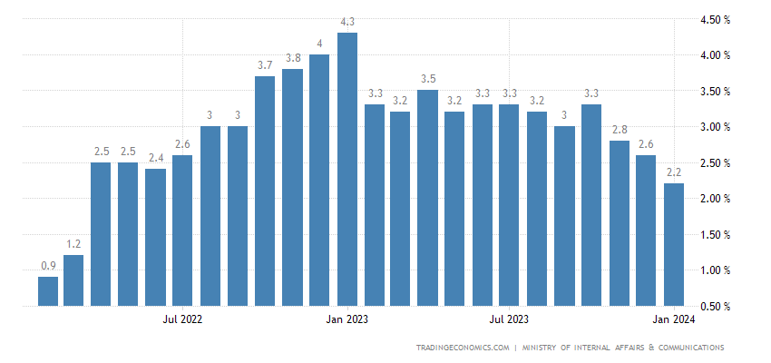 La tasa de inflación anual en Japón bajó al 2,2% en enero de 2024 desde el 2,6% del mes anterior, apuntando la cifra más baja desde marzo de 2022. Los precios de los alimentos registraron la menor subida en 16 meses (5,7% vs 6,7% en diciembre).