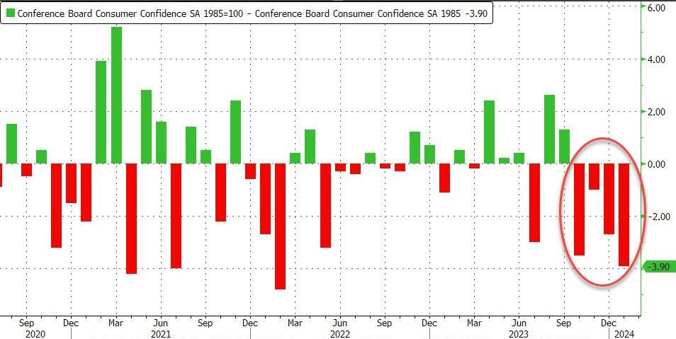 4- Pero, por cuarto mes consecutivo, The Conference Board revisó significativamente a la baja sus datos de confianza del consumidor. De hecho, la de enero fue la mayor revisión a la baja desde febrero de 2022...