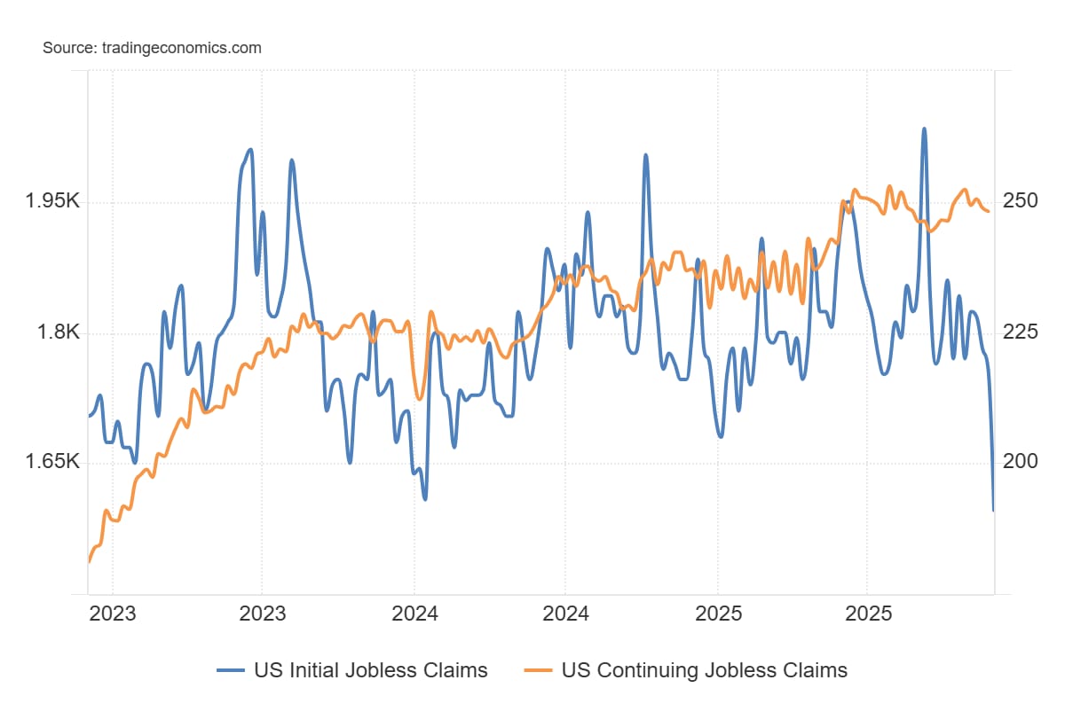 Las solicitudes iniciales de desempleo en EE. UU. cayeron en 27.000 respecto a la semana anterior, hasta 191.000 en la última semana de noviembre, encadenando cuatro descensos consecutivos y situándose muy por debajo de las expectativas del mercado (220.000), en su nivel semanal más bajo desde 2022.