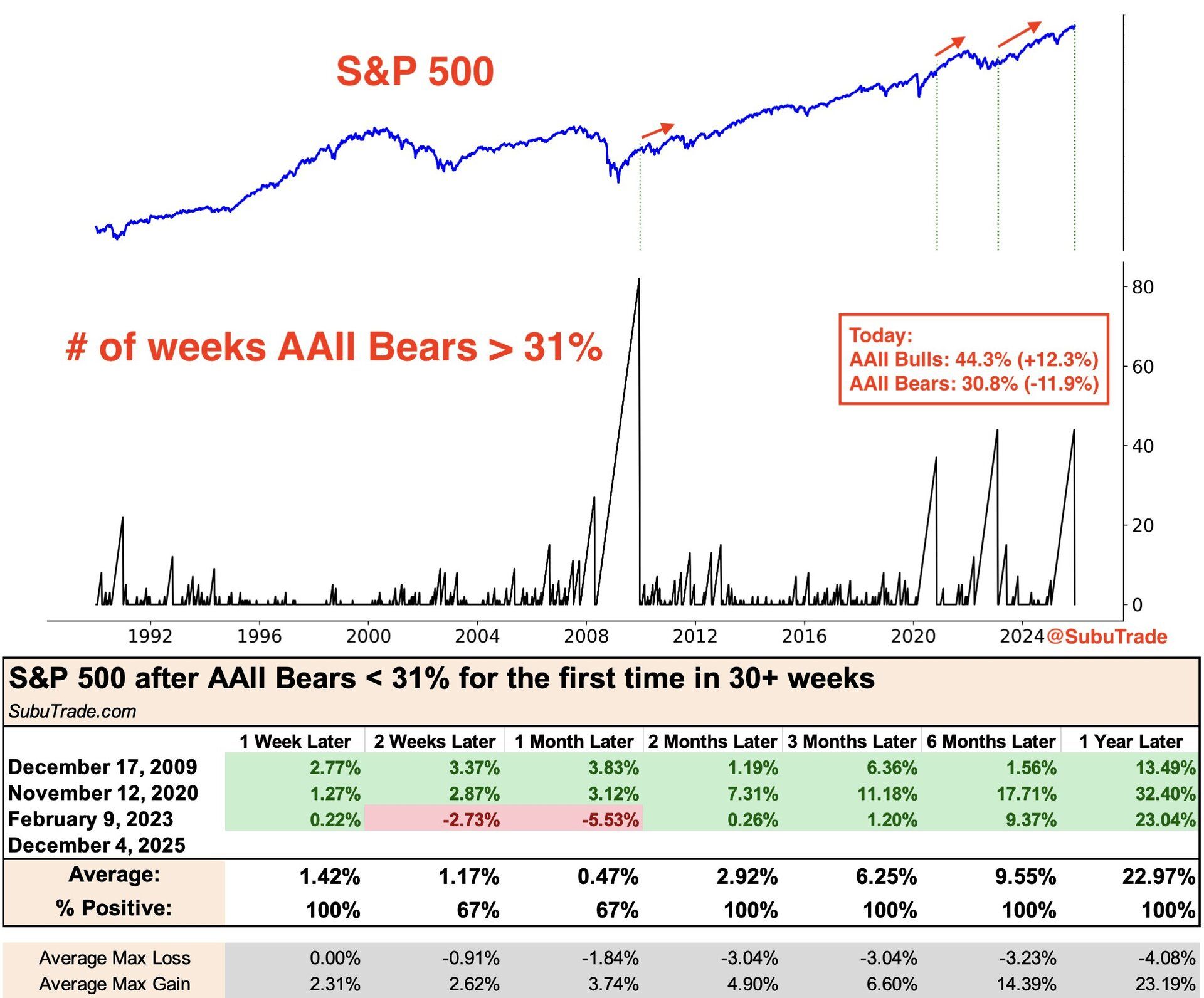 Históricamente, el S&P 500 estuvo más alto un año después, con una media de +23%. Vía SubuTrade