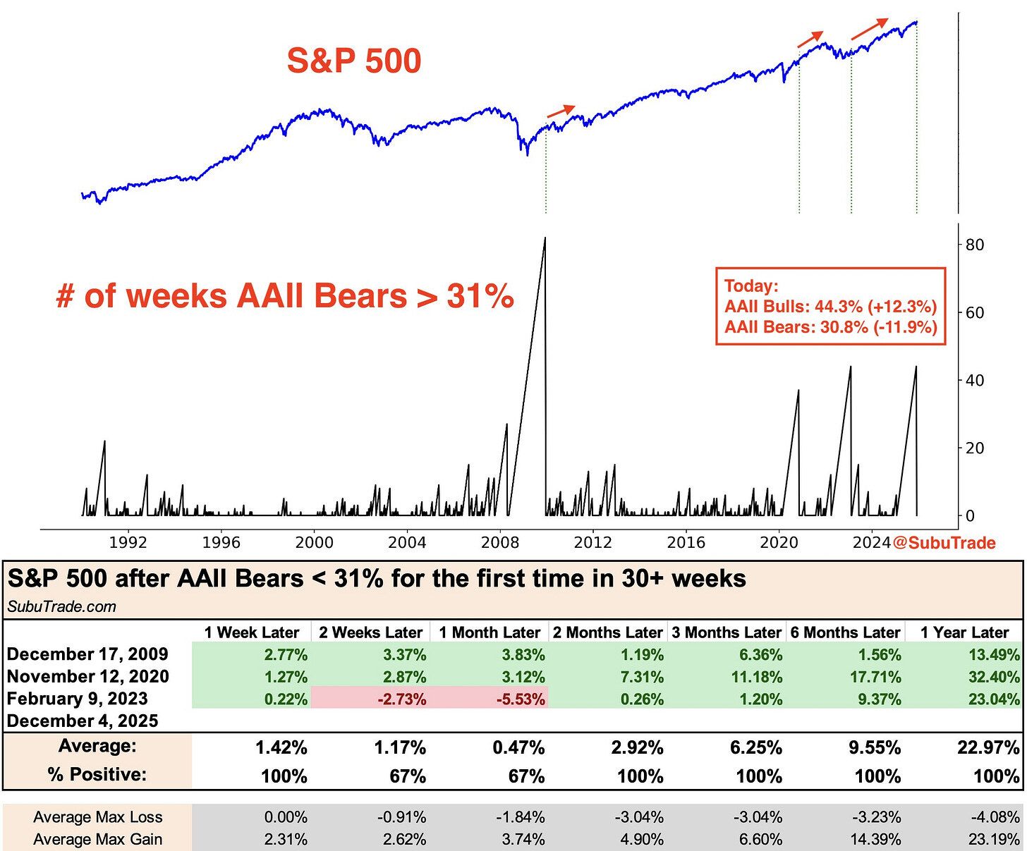Por primera vez en 44 semanas, los bajistas de la encuesta AAII cayeron por debajo del 31%.